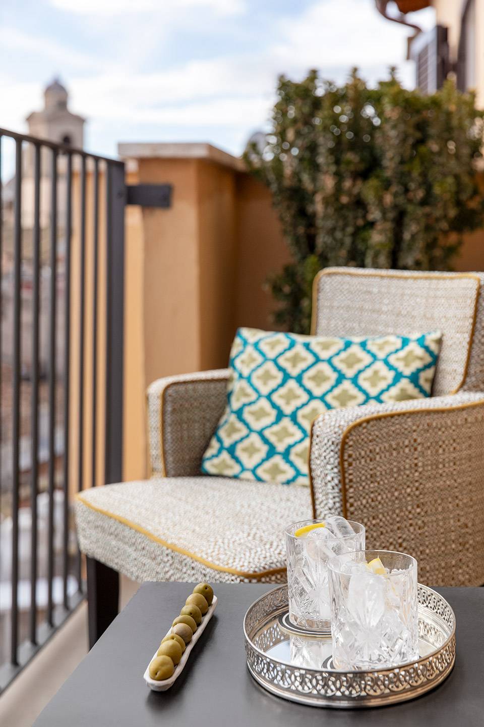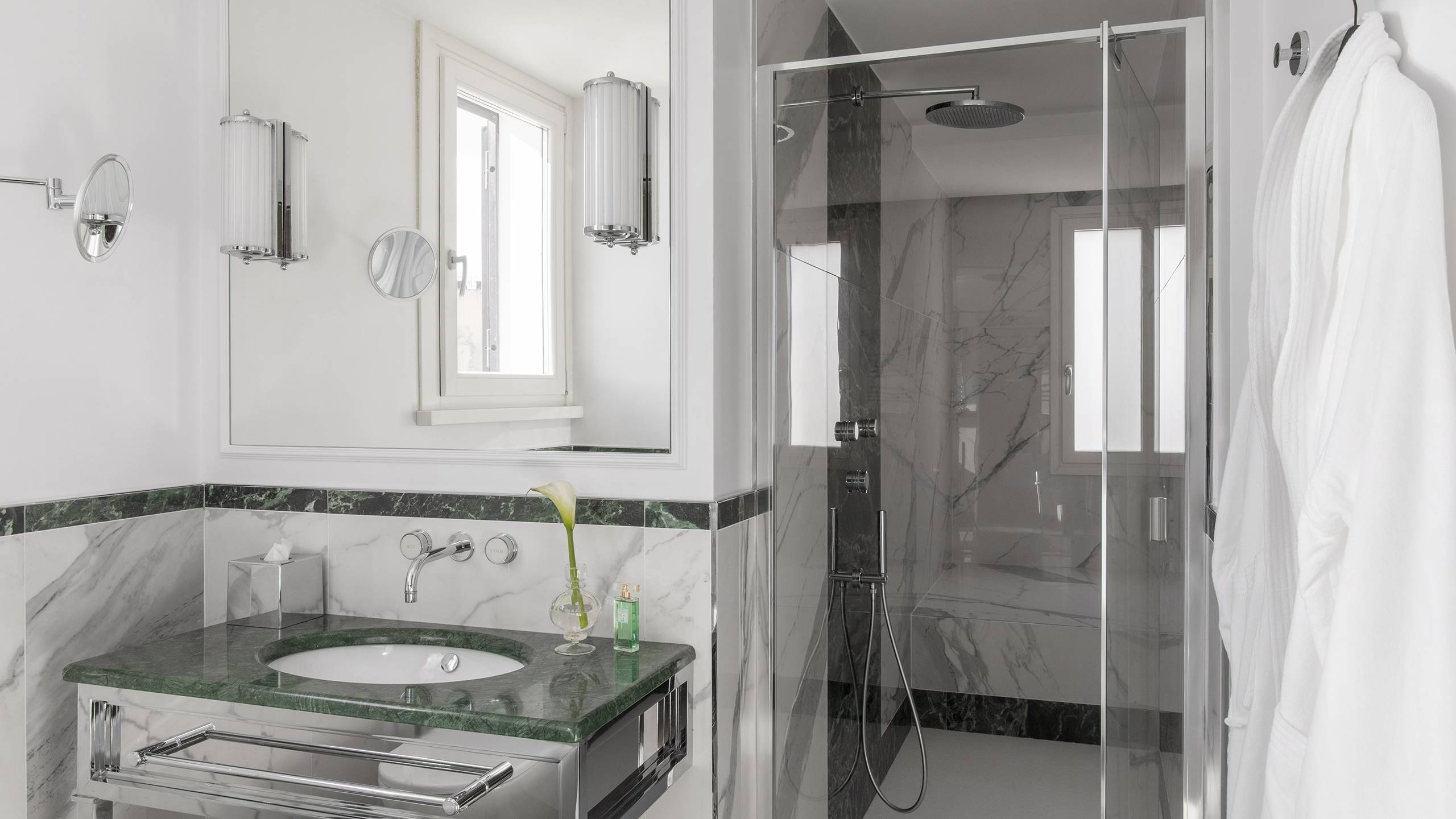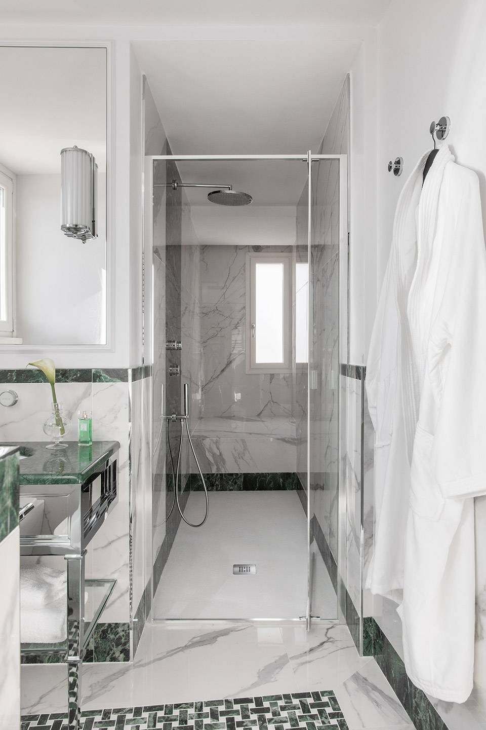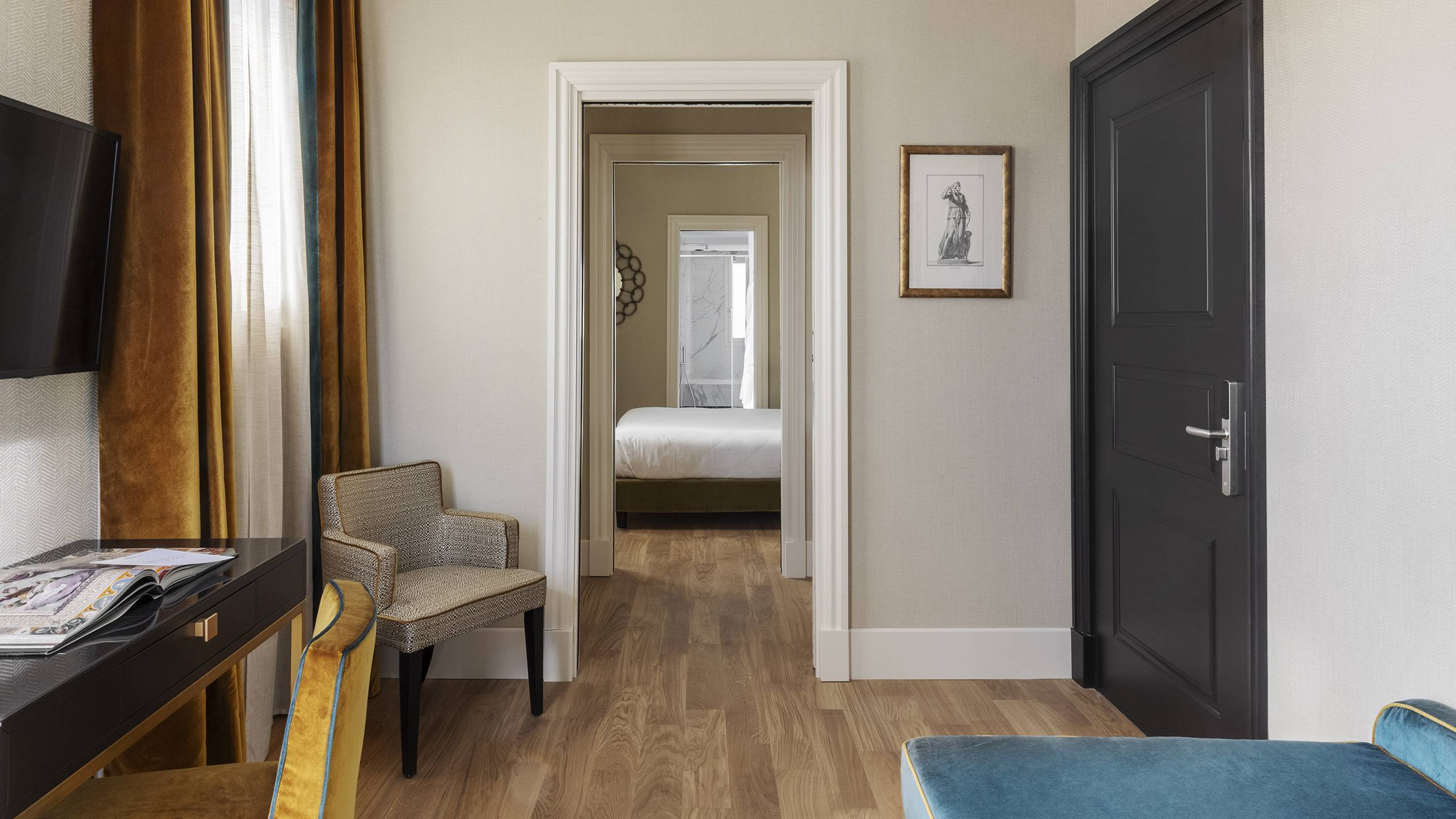 At the top floor of Hotel Adriano Rooftop, with a panorama that captures the eternal essence of the city, the Executive Suite is a haven of charm. Divided into two areas, the suite features a refined living space with a chaise longue, armchairs, and a desk, an elegant double bedroom, and a small balcony. The bathroom is entirely clad in marble, featuring the exquisite tones of Verde Guatemala and Nero Africa Zimbabwe.