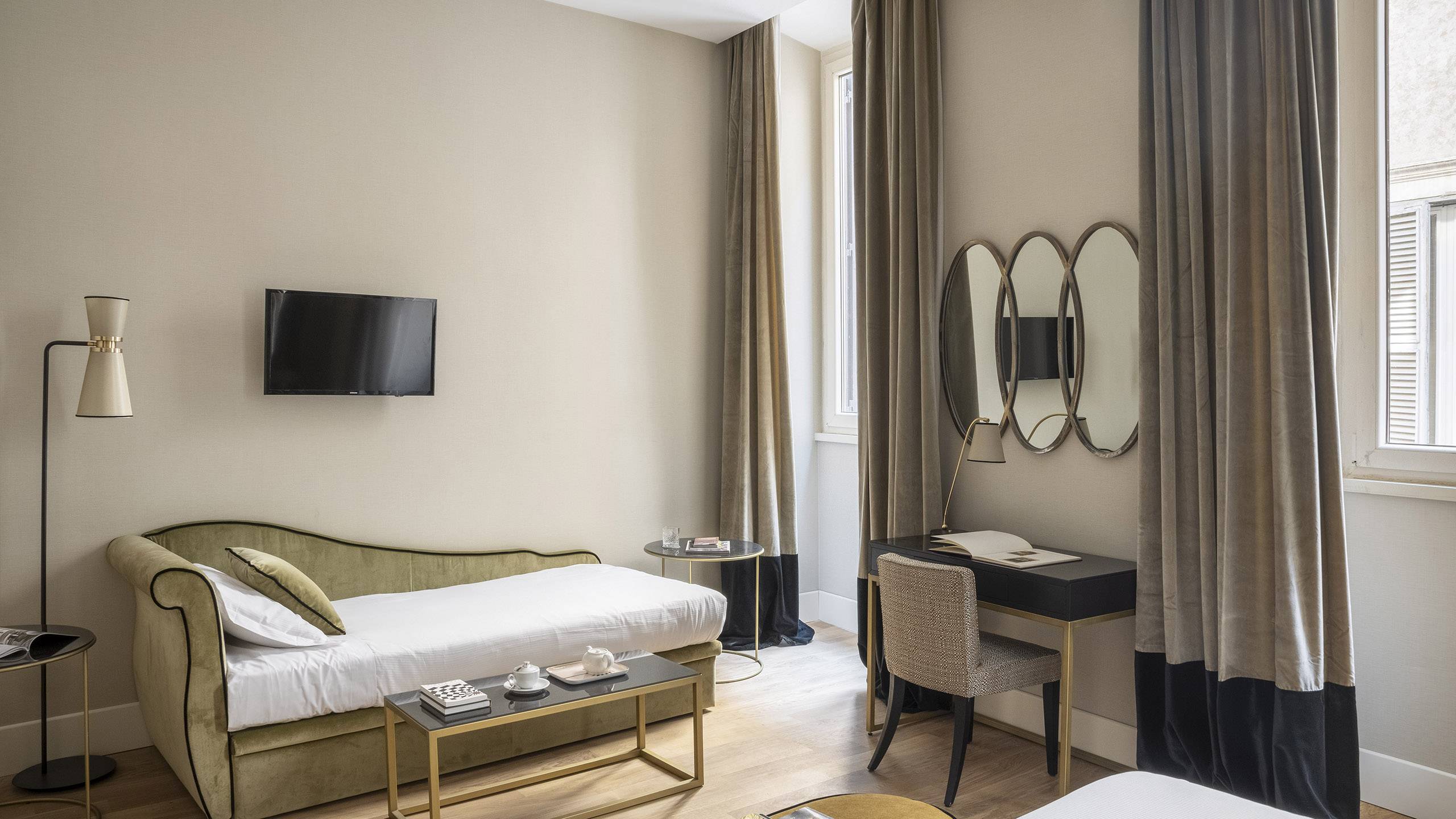 Perfect for those who desire more space and comfort, this Suite of approximately 30 m² can accommodate up to four people. The bed, available in king or twin configuration, is equipped with an orthopedic topper to ensure maximum well-being during sleep. The view opens onto a peaceful inner courtyard or the lively street, offering an authentic and welcoming atmosphere. Ideal for families or small groups seeking a comfortable stay in the heart of the city.