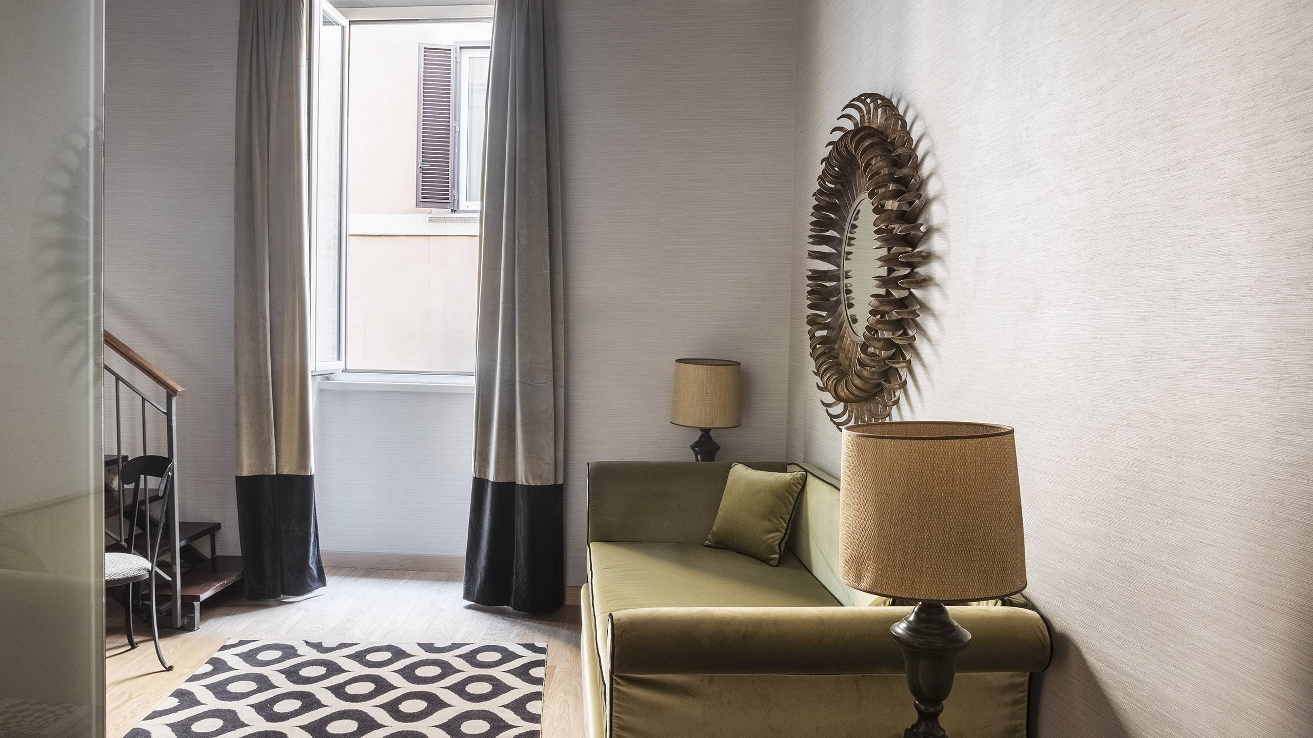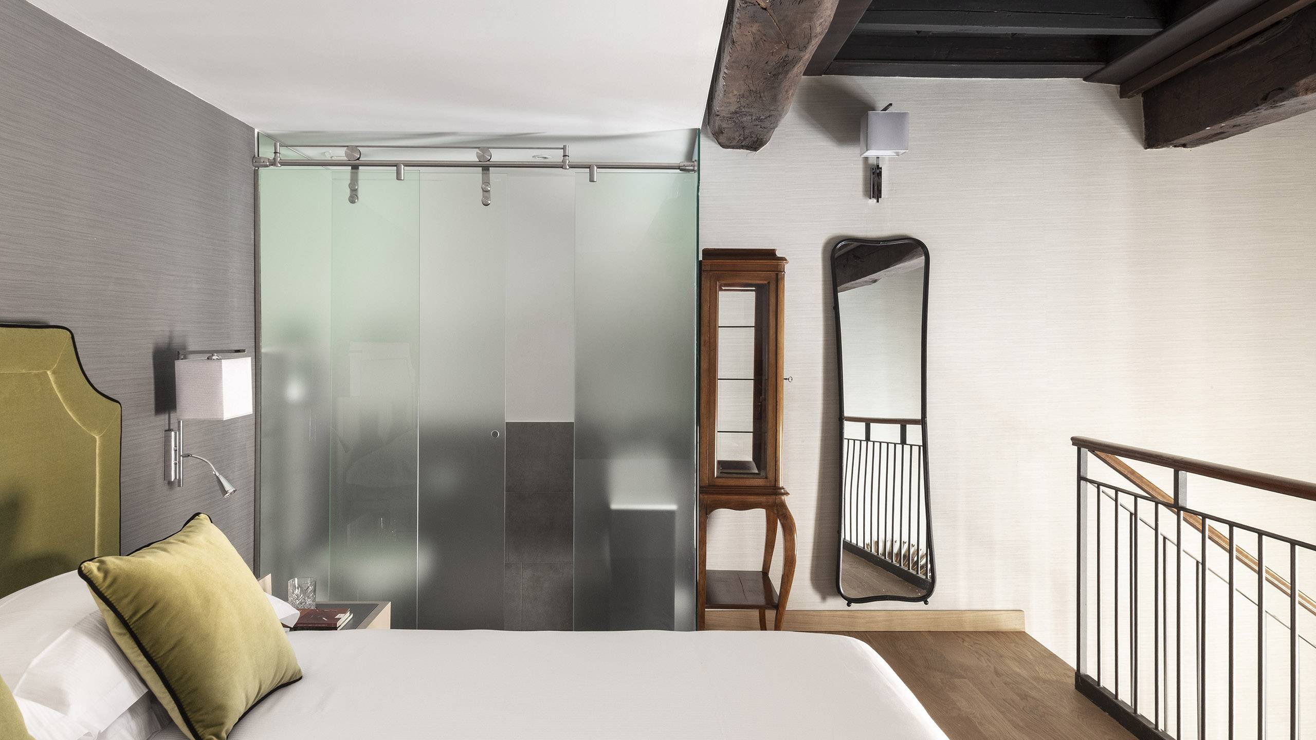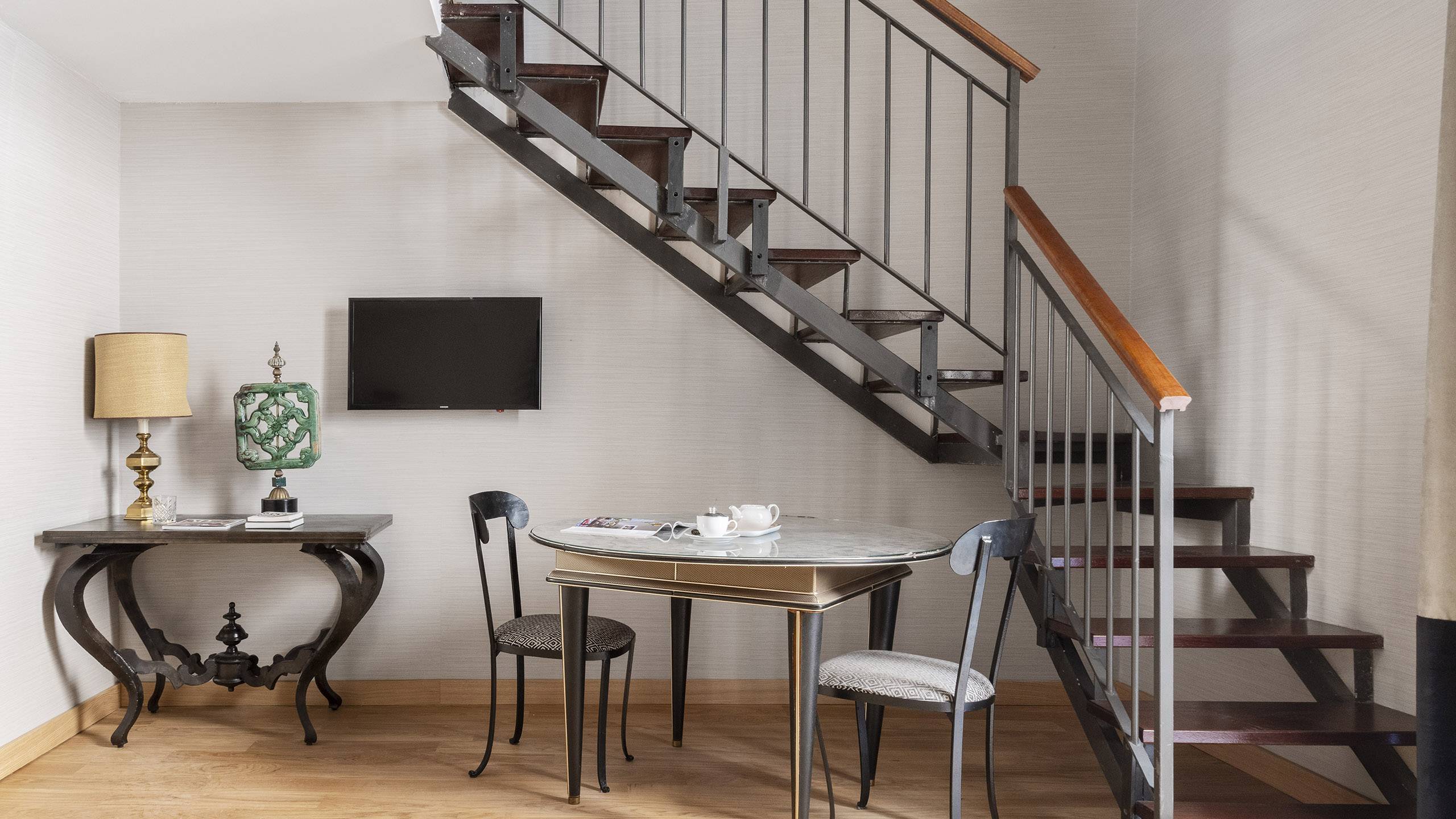 Our two Suites are the ideal retreat for a stay dedicated to comfort. Spacious and elegant, every detail is designed to provide a sophisticated ambiance, perfect for relaxation and rejuvenation. One of the two is spread over two levels: the lower level features a living area with a sofa, armchairs, desk, and a bathroom with a bathtub; the upper level houses the bedroom with a small bathroom.